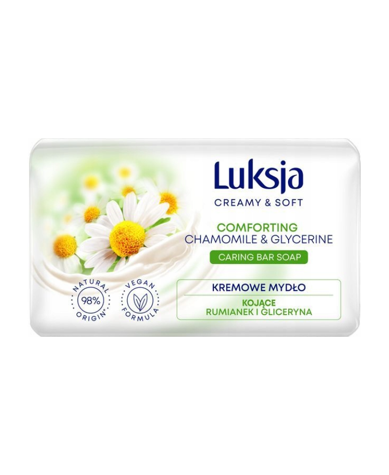 Kremowe mydło w kostce Luksja Creamy & Soft Rumianek i Gliceryna skutecznie oczyszcza skórę, pozostawiając na dłoniach subtelny zapach.