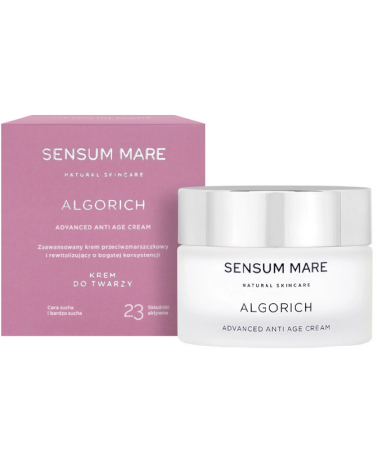 Krem do twarzy Sensum Mare Algorich został stworzony z myślą o specjalistycznej pielęgnacji cery suchej i bardzo suchej. Potężna dawka 27 składników aktywnych skutecznie odżywia, nawilża i ujędrnia skórę nadając natychmiastowe uczucie komfortu podrażnionej skórze. Krem wspomaga redukcję zmarszczek oraz zwalcza oznaki starzenia skóry.