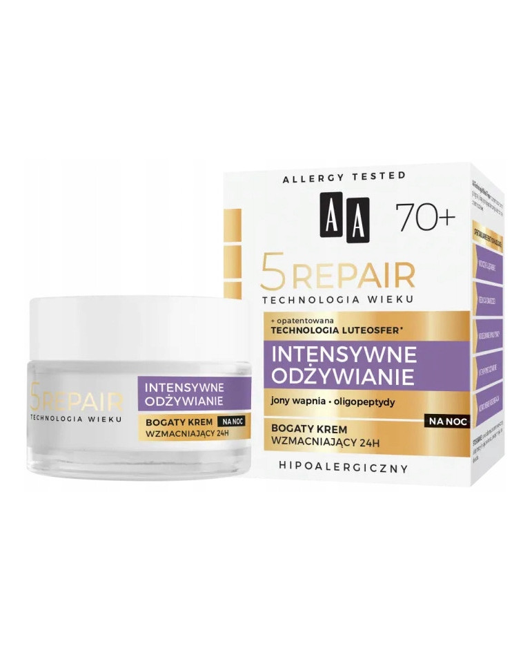 AA TECHNOLOGIA WIEKU 5 Repair to przełomowa seria aktywnych, multifunkcjonalnych kremów, która działa kompleksowo w pięciu najważniejszych obszarach, odpowiedzialnych za spowalnianie procesu starzenia się skóry i silne działanie naprawcze (nawilża, odbudowuje, wzmacnia, stymuluje i chroni).