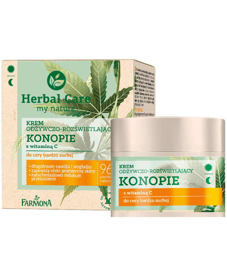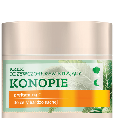 Nasz krem odżywczo- rozświetlający z olejem konopnym i witaminą C opracowaliśmy do pielęgnacji cery bardzo suchej. Jego nawilżającą formułę skomponowaliśmy z ekstraktów roślinnych pozyskiwanych ze źródeł odnawialnych.