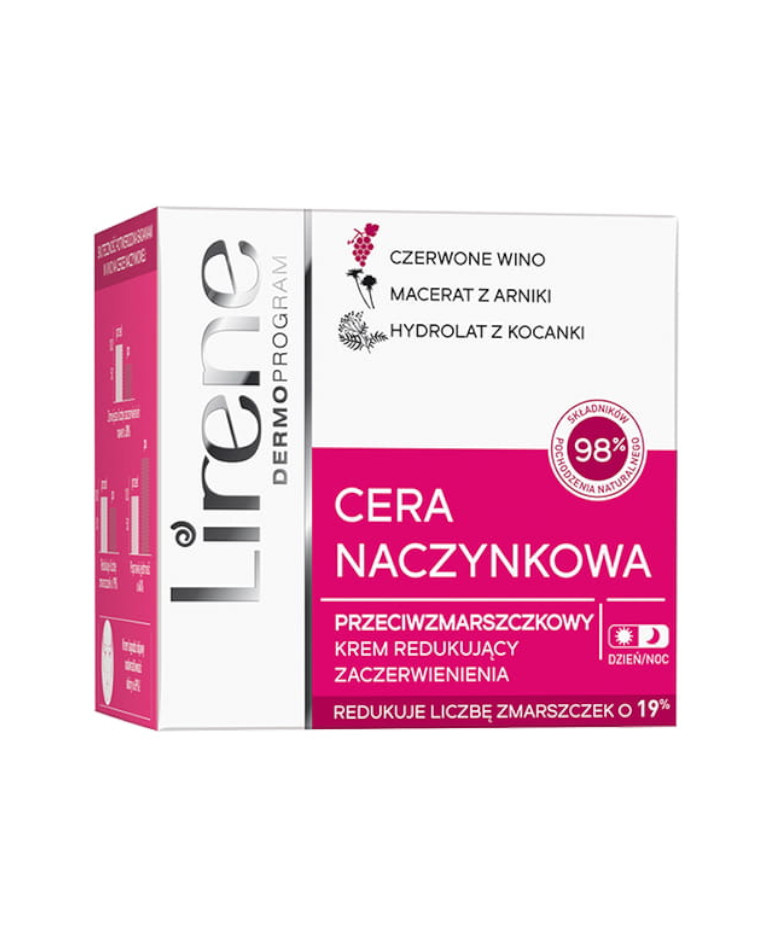 Przeciwzmarszczkowy krem redukujący zaczerwienienia został stworzony przez Ekspertki Lirene z myślą o wymagającej, delikatnej cerze naczynkowej. Krem zawiera 98% składników pochodzenia naturalnego.