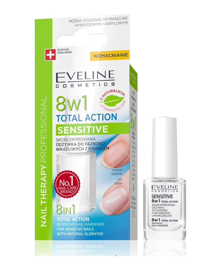 Wersja SENSITIVE bestsellerowej odżywki 8w1 Total Action przeznaczona jest do kompleksowej pielęgnacji paznokci szczególnie wrażliwych i uszkodzonych.