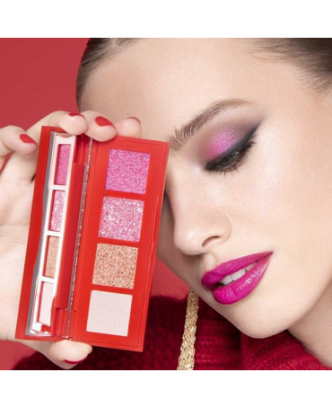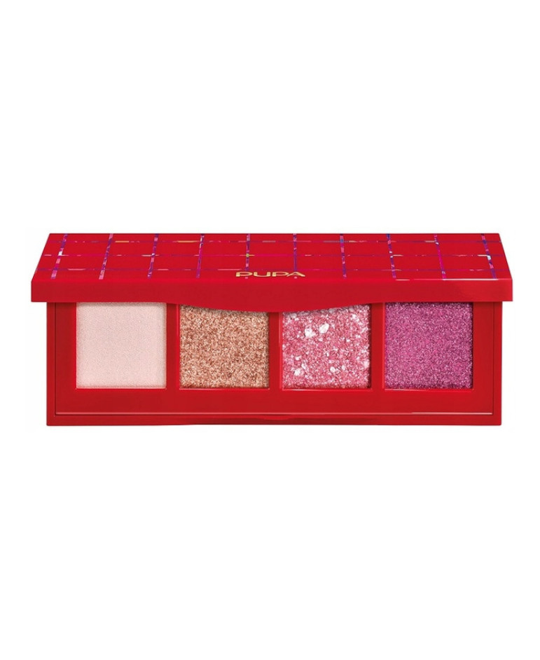 Świąteczną atmosferę kolekcji poczujesz w zapachach i teksturach produktów, przezroczystych i opalizujących efektach, które tworzą na skórze oraz ich ciepłych odcieniach. Stwórz makijaż oczu z metalicznym wykończeniem w kolorze różowego złota i czerwieni, z ekscentrycznymi akcentami w kolorze fuksji za pomocą palety 4 cieni do powiek!Wewnątrz palety znajdziesz 3 różne wykończenia:SATYNOWE: jedwabiste w dotyku, o promiennym wykończeniu.