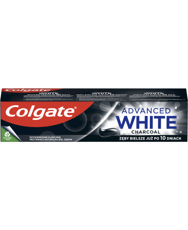 Pasta do zębów Colgate® Advanced White Charcoal zawiera system SmartFoam i węgiel aktywny, który skutecznie usuwa powierzchniowe przebarwienia, przywracając naturalną biel zębów już po 10 dniach stosowania.