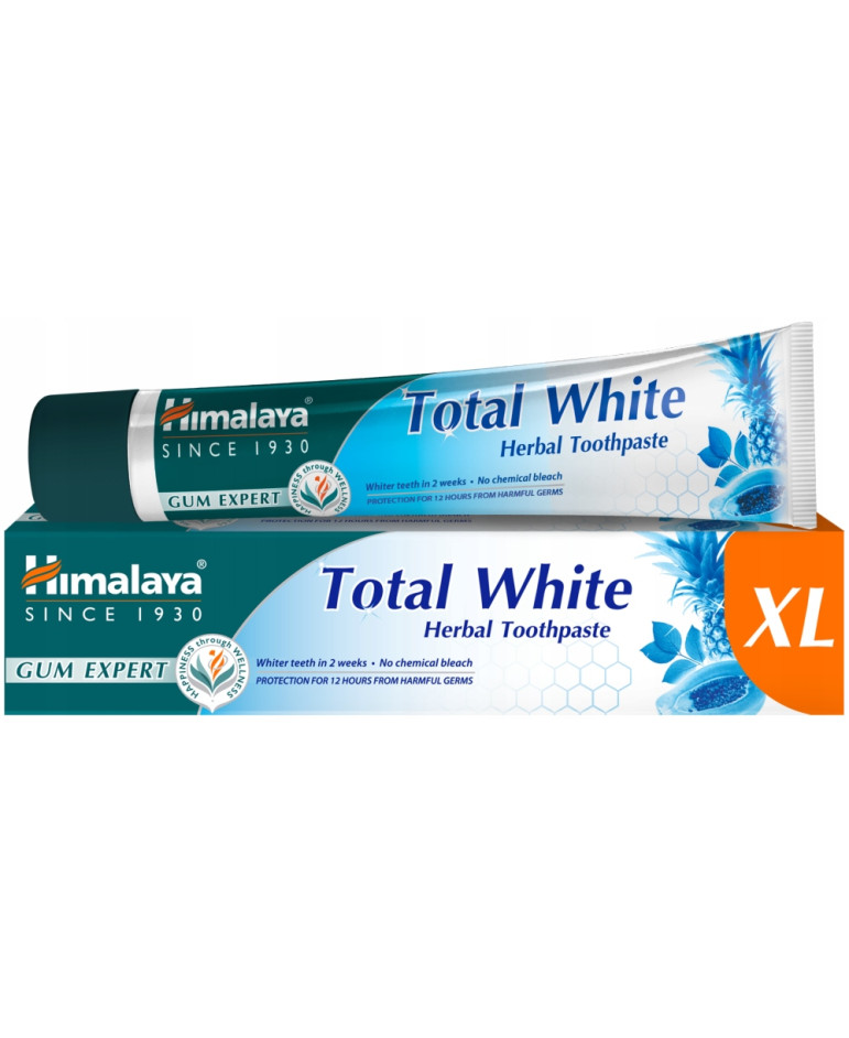Ziołowa pasta do zębów Himalaya Total White, dzięki przełomowej ziołowej formule Naturalnych Enzymów Roślinnych z Papai oraz Ananasa, widocznie usuwa przebarwienia. Sprawia, że zęby stają się bielsze już po 2 tygodniach.