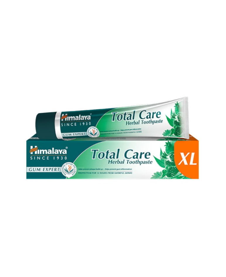 Himalaya Total Care Ziołowa Pasta do zębów to zaawansowana formuła ziołowa, która zapewnia 12-godzinną ochronę przed szkodliwymi zarazkami, pomaga zapobiegać krwawieniu dziąseł i gromadzeniu się płytki nazębnej na zębach.