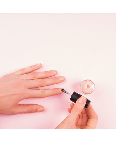 e. W pierwszej czynności należy namoczyć jednorazowo pędzelek w preparacie i nałożyć go jednym pociągnięciem na płytce na każdym z 5 paznokci. Nie trzeba moczyć kilkakrotnie pędzelka przy nakładaniu preparatu na każdy paznokieć. Przy drugiej ręce czynność powtórzyć. Następnie można zacząć nakładać manicure zgodnie z zasadami.