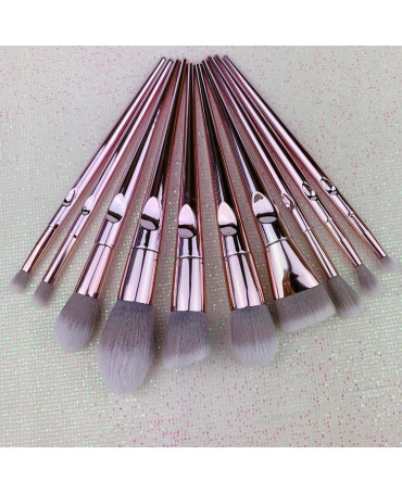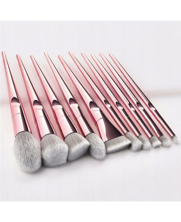 Zestaw 10 profesjonalnych pędzli wykonanych z wysokiej jakości włosia syntetycznego, osadzonych w metalowej skuwce.