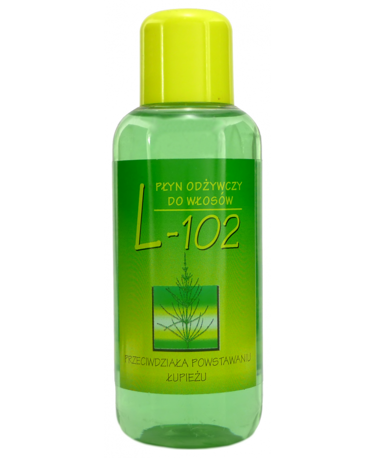 Płyn L-102 odżywia skórę głowy i zapobiega wypadaniu oraz zagęszcza włosy. Dzięki zawartości witamin i substancji białkowych wpływa pobudzająco na cebulki włosów i przeciwdziała powstawaniu łupieżu.