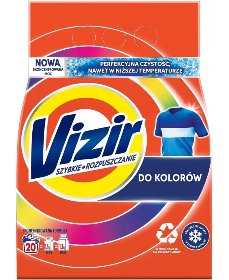 Vizir to proszek do prania, który skutecznie radzi sobie z trudnymi zabrudzeniami, takimi jak plamy na mankietach, kołnierzykach i obszarze pod pachami. Doskonale sprawdza się również przy praniu kolorowych ubrań, zapewniając im dokładne i higieniczne oczyszczenie.