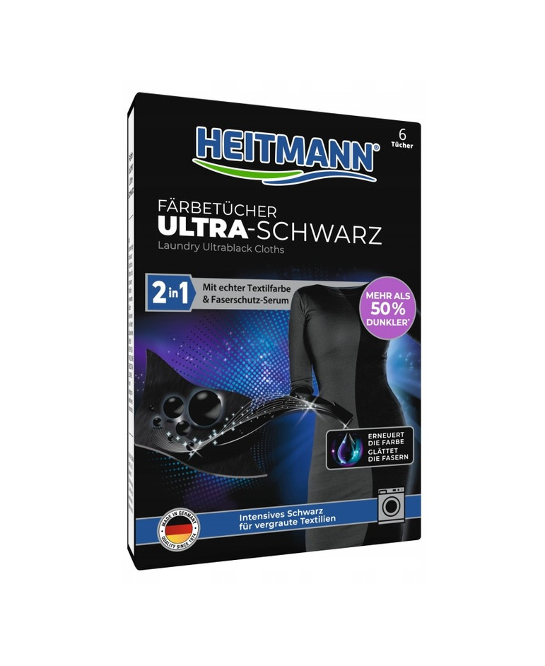 Heitmann Ultra-Schwarz chronią kolor przed blaknięciem. Dzięki tym niezwykłym chusteczkom kolor Twoich ulubionych ubrań pozostanie tak samo intensywny, jak na początku, po zakupie.