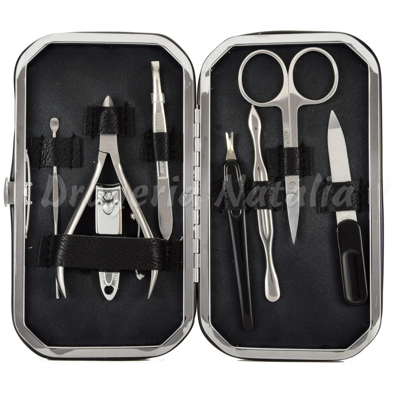 Praktyczny zestaw do manicure w eleganckim, poręcznym etui zamykanym na zatrzask. Zewnętrzna część etui jest w kolorze czarnej skóry. Elementy zestawu zostały wykonane z wysokiej jakości. Niezastąpiony zarówno w podróży jak i na co dzień. Idealnie nadaje się na prezent.