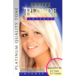 Luksusowy rozjaśniacz do włosów BLONDE DE LUXE intense pozwala uzyskać naturalnie wyglądające odcienie blond nawet o 7 tonów jaśniejsze od wyjściowego koloru włosów. Intensywna maska do włosów rozjaśnianych - doskonale wygładza i ułatwia rozczesywanie. Włosy pozostają lśniące, dobrze nawilżone i wyraźnie zregenerowane. Już po 40 min. od zastosowania BLONDE DE LUXE intense Twoje włosy emanują luksusowym blaskiem naturalnego blondu.
