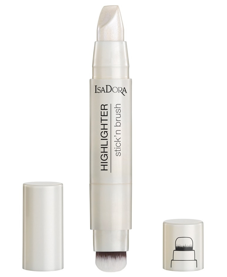 Nałóż pędzel Highlighter Stick’n Brush na szczyty policzków, łuk brwiowy, grzbiet nosa i łuk Kupidyna. Rozetrzyj za pomocą wbudowanego pędzla.