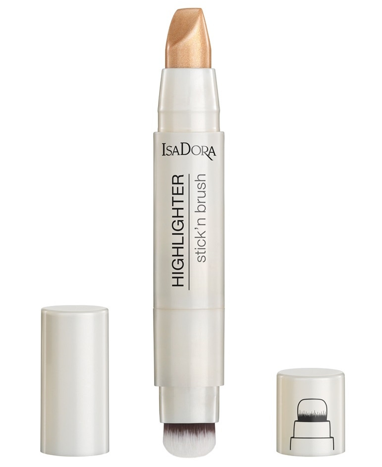 Nałóż pędzel Highlighter Stick’n Brush na szczyty policzków, łuk brwiowy, grzbiet nosa i łuk Kupidyna. Rozetrzyj za pomocą wbudowanego pędzla.