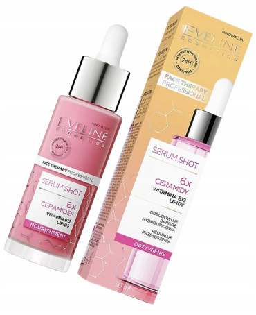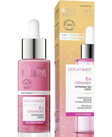 Eveline Serum Shot Kuracja Odżywcza z 6x ceramidami 30 ml to wyjątkowa i skuteczna kuracja, która została stworzona z myślą o cerze wrażliwej i przesuszonej. Doskonale sprawdzi się po intensywnych zabiegach kosmetycznych oraz po zimie czy upalnym lecie, kiedy skóra wymaga szczególnej troski.