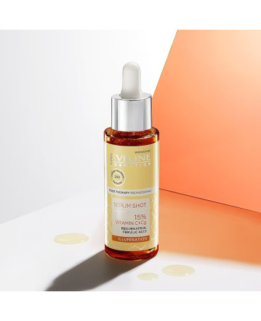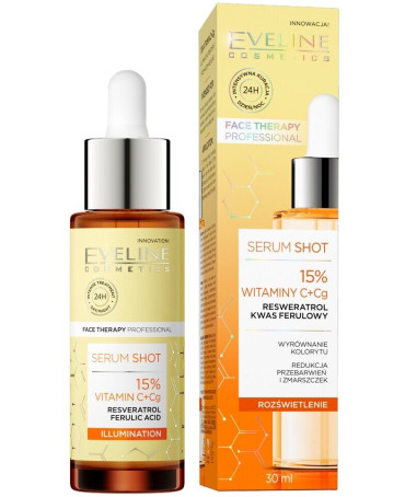 Eveline Cosmetics Serum do Twarzy Shot z 15% witaminą C + Cg to luksusowa kuracja, której skóra pokocha. Dzięki innowacyjnej formule z 15% witaminy C + Cg, resweratrolem oraz kwasem ferulowym, serum rozświetla i wyrównuje koloryt skóry, zapewniając młody wygląd i blask.