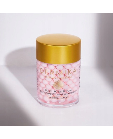 Luksusowe serum przeciwzmarszczkowe w kapsułkach dla cery dojrzałej. W momencie aplikacji kremowe kapsułki pełne skoncentrowanych składników aktywnych łączą się z zawartym w żelu kwasem hialuronowym, zmieniając się w jedwabiste, aksamitne serum idealnie dopasowujące się do skóry.