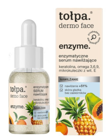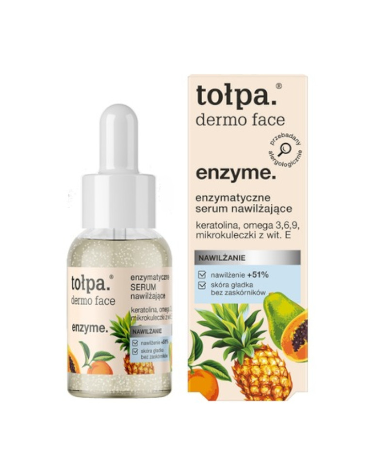 Tołpa - Enzyme - Enzymatyczne Serum Nawilżające - serum wspomagające procesy złuszczania, dzięki zawartości enzymu z bakterii Bacillus. Składnik ten usuwa martwe komórki naskórka, wygładza skórę i pozwala intensywniej działać formule produktu.