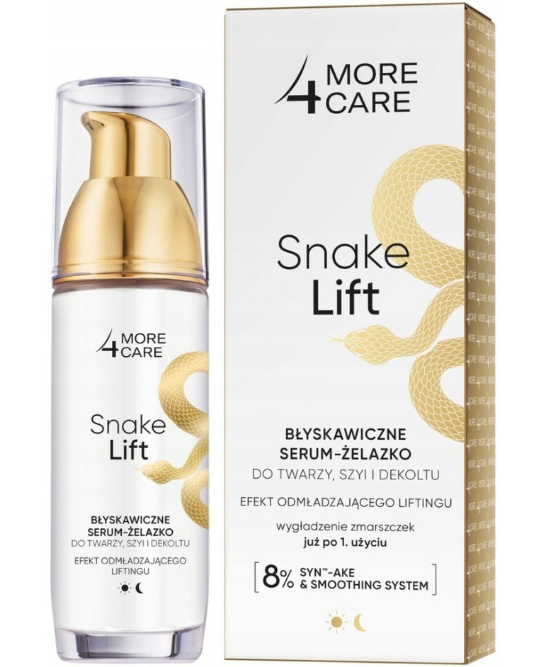Odkryj niezwykłą moc serum-żelazka Snake Lift od More 4 Care, które zapewnia spektakularny efekt wygładzenia zmarszczek już po pierwszym użyciu. To więcej niż zwykłe serum przeciwzmarszczkowe - to zaawansowana formuła, która natychmiastowo ujędrnia, odmładza i modeluje kontur twarzy.