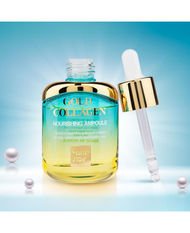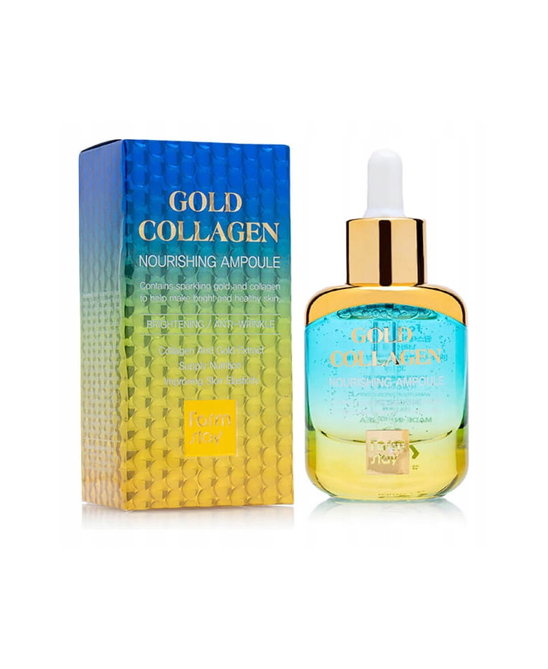 Farmstay Gold Collagen ze złotem, kolagenem i niacymidem. Dzięki tym składnikom ampułka pomaga nawilżyć, ujędrnić i rozjaśnić zmęczoną skórę, sprawiając się wygląda ona zdrowiej.