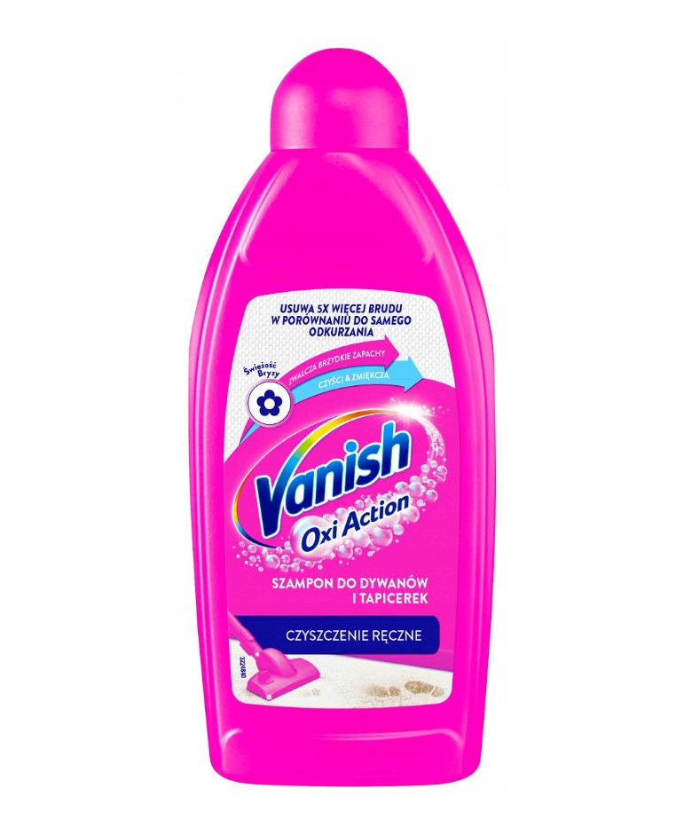 Vanish Oxi Action Szampon do dywanów, tapicerki i wykładzin usuwa aż 5 razy więcej brudu niż podczas zwykłego odkurzania. Dzięki swojemu aromatowi i aktywnym składnikom neutralizuje także nieprzyjemne zapachy. Płyn zmiękcza powierzchnię dywanu i nadaje niebywałej świeżości. Ponadto skutecznie usuwa sierść zwierząt.