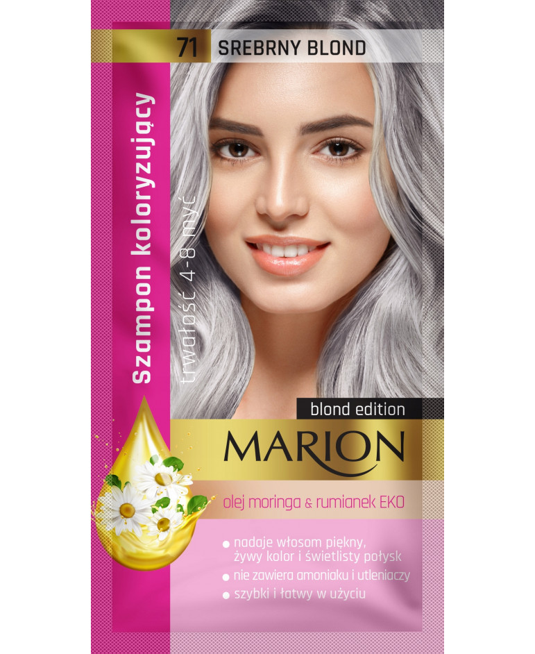 Szampon koloryzujący MARION to wyjątkowy łagodny produkt stworzony, aby nadać włosom piękny, wyrazisty i pełen blasku kolor. Pozwala w szybki sposób zmienić odcień włosów lub go odświeżyć. Unikalna formuła bez amoniaku i wody utlenionej, zawiera ekstrakt z rumianku eko oraz olej moringa, które wzmacniają i regenerują włosy. Dzięki zastosowaniu żelowej konsystencji, produkt równomiernie pokrywa całe włosy.