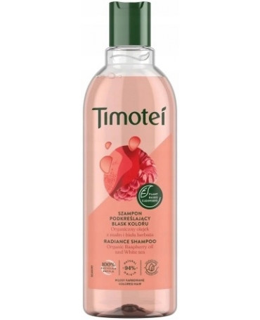 Twoje farbowane włosy potrzebują szczególnej troski? Wypróbuj szampon Timotei Olśniewający kolor! Formuła z obniżoną ilością siarczanów, wzbogacona 100% naturalnym olejkiem z nasion czerwonej maliny i naturalnego ekstraktu z białej herbaty, delikatnie oczyszcza i odżywia Twoje farbowane włosy, aby utrzymać ich żywy kolor. Piękno bez sztuczek.