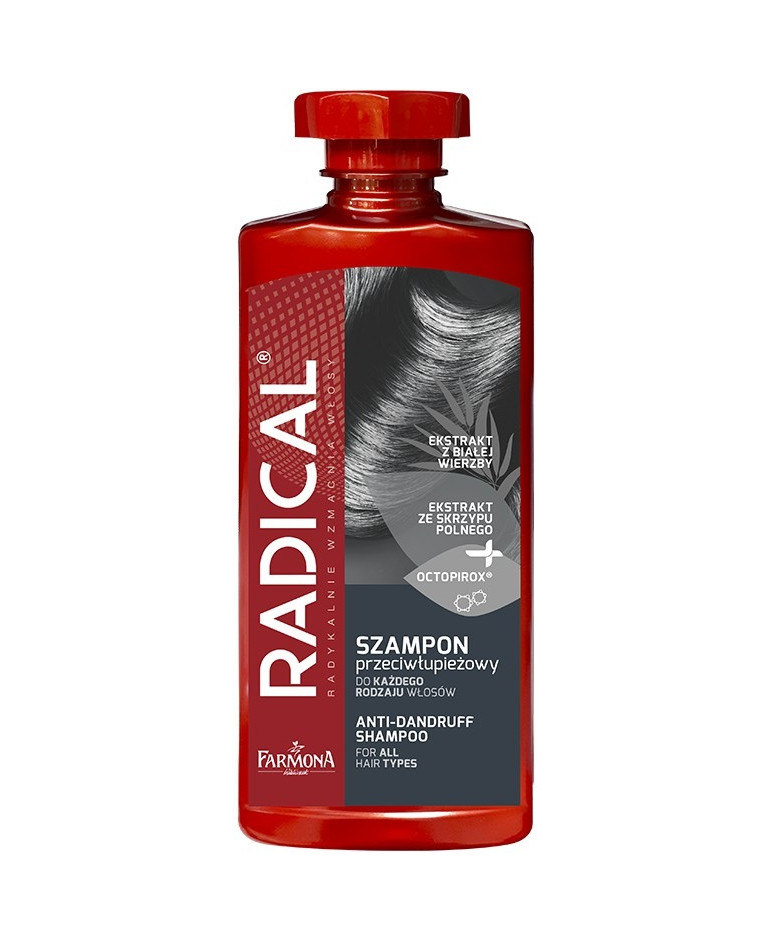 Radical to prawdziwy przełom w pielęgnacji oraz w walce z wypadaniem włosów i łupieżem. Szampon przeciwłupieżowy gwarantuje potrójną siłę działania: wyraźnie wzmacnia włosy, likwiduje łupież i zmniejsza skłonność do jego powstawania.