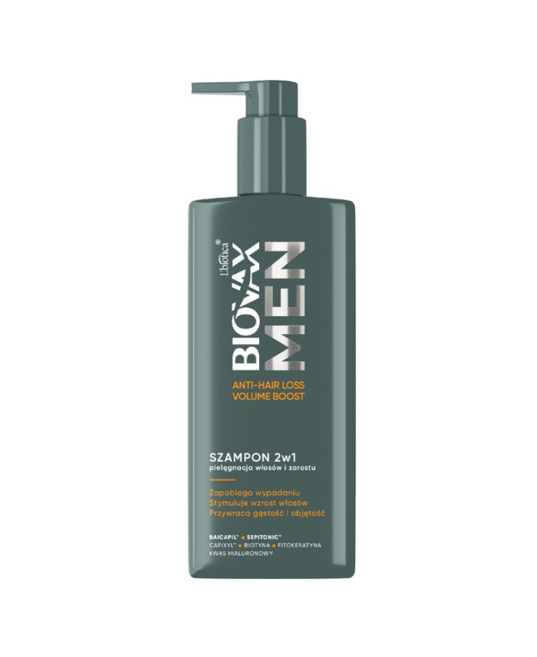 Biovax Men to zaawansowana linia kosmetyków stworzona specjalnie do codziennej pielęgnacji włosów i zarostu męskiego. Szampon 2w1 dokładnie oczyszcza, skutecznie przeciwdziała wypadaniu włosów i dodaje objętości. Jego unikalna formuła zawiera składniki o udowodnionej skuteczności, takie jak biotyna, fitokeratyna, kwas hialuronowy oraz trzy selektywne kompleksy: