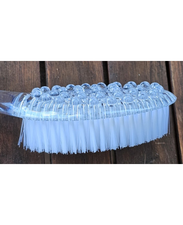 Dwustronna szczotka kąpielowa z jednej strony z drobnym miękkim włosiem syntetycznym z drugiej strony twardymi owalnymi wypustkami do masażu ciała. Szczotka do codziennej pielęgnacji ciała regularne używanie szczotki poprawia krążenie krwi w skórze.