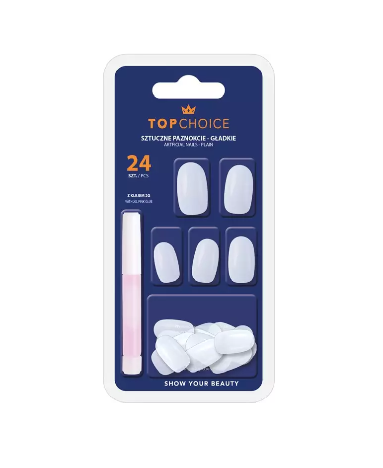 Zestaw 24 sztucznych gładkich paznokci z różowym klejem 2g. Do samodzielnej aplikacji. Paznokcie wykonane z estetycznego, trwałego, elastycznego i sprężystego tworzywa ABS – nie pękają, nie kruszą się i nie bieleją na załamaniach. Kolor biały.