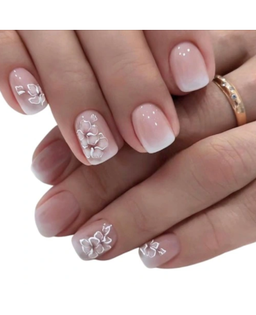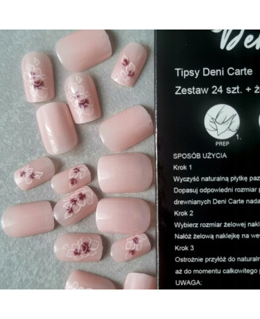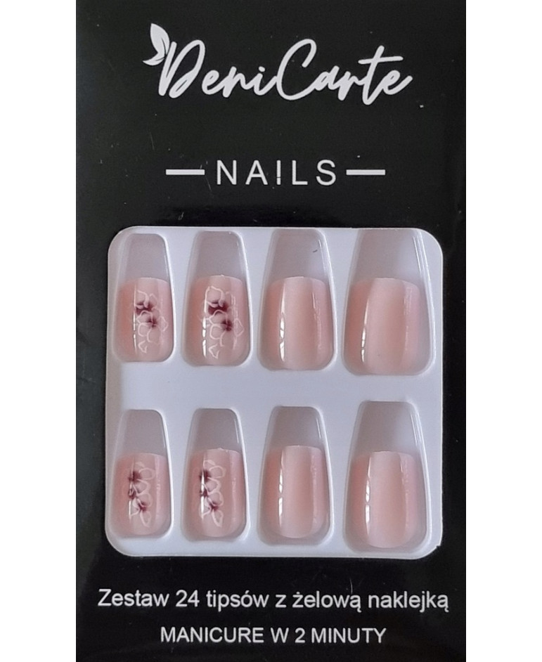 Gotowe tipsy, paznokcie kwadrat. Naklejane sztuczne paznokcie zdobione. Tipsy ombre w kolorze nude ze wzorem. Kwiatowe zdobienie.