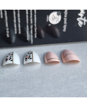 Zestaw składa się z 24 sztuk naklejek dwustronnie przylepnych oraz paznokci wykonanych z wysokiej jakości tworzywa sztucznego, które jest bardzo elastyczne i trwałe.