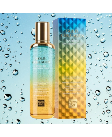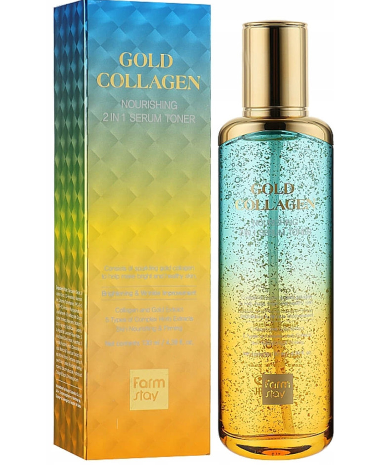 Toner i serum 2w1 Farmstay Gold Collagen charakteryzuje się bogatą konsystencję jak serum i jednocześnie lekkim wchłanianiem jak tonik, pomaga nawilżyć i wygładzić szorstką skórę.
