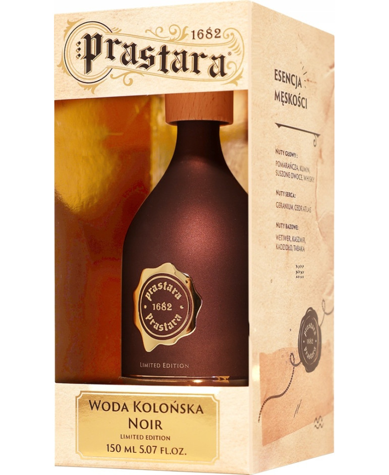 Woda kolońska Noir w limitowanej edycji od marki Prastara to zapach, który otwiera się świeżymi nutami pomarańczy, kuminu, suszonych owoców i aromatycznego whisky, a następnie harmonijnie przechodzi w głębokie tony geranium i cedru atlas, aby w finale otulić ciepłym i zmysłowym zapachem wetywerii, kaszmiru, kadziła i tabaki.