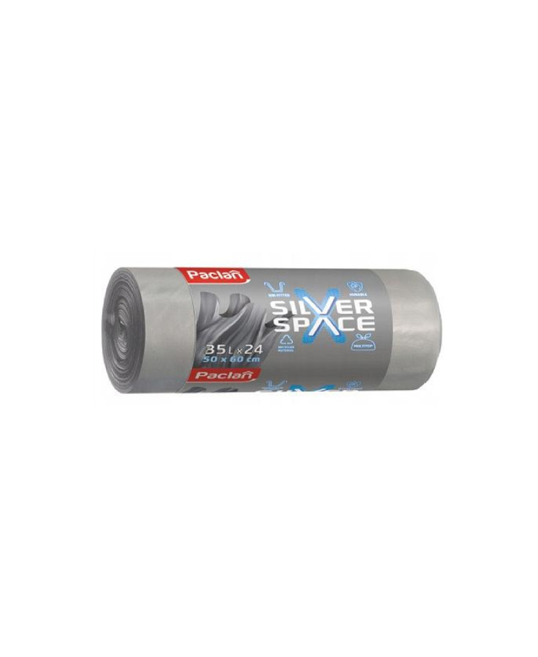 Paclan Worki na śmieci Silver Space - praktyczne, wytrzymałe i łatwe w użyciu, dzięki czemu doskonale sprawdzą się zarówno w domu, jak i w biurze. Zawiązywane uszy ułatwiają wynoszenie śmieci, zapewniając komfort.