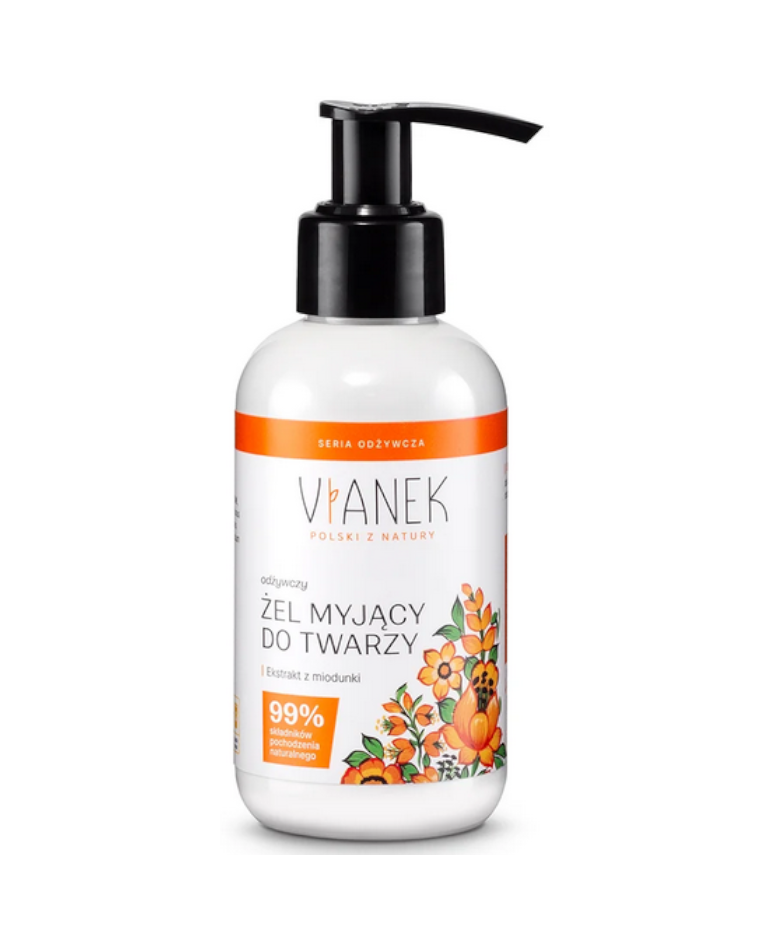 Żel do twarzy przeznaczony do codziennego mycia każdego rodzaju cery.Zawiera łagodne detergenty, skutecznie oczyszczające twarz z makijażu i zabrudzeń. Miód, bogaty w witaminy olej z pestek moreli i lecytyna sojowa gwarantują utrzymanie właściwego nawilżenia. Ekstrakt z miodunki to bogactwo składników odżywczych, dzięki czemu żel dodatkowo wzmacnia i chroni skórę przed podrażnieniami.