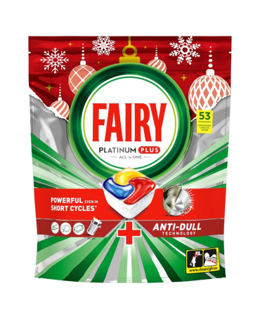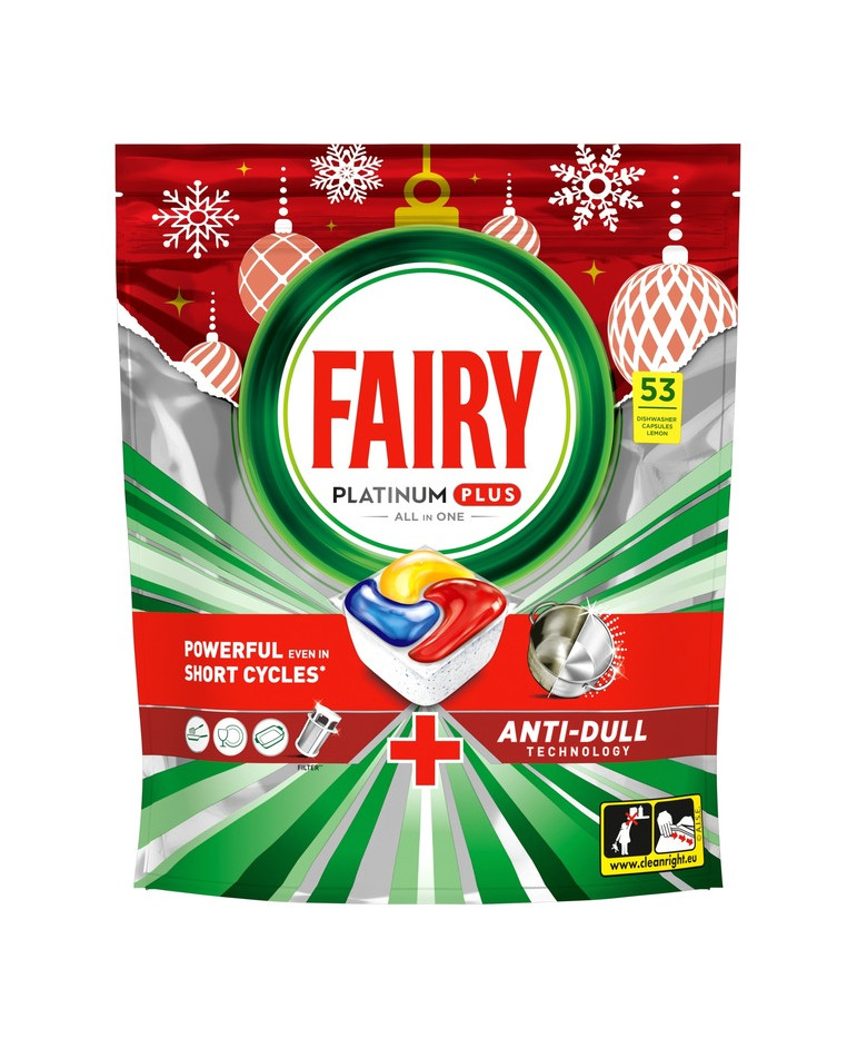 Kapsułki do zmywarki All In One Fairy Platinum działają już przy 1. myciu i usuwają nawet trudne zabrudzenia, pozostawiając naczynia czyste i lśniące.